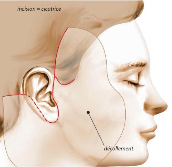 A partir des incisions, un décollement est fait sous la peau; son étendue est fonction de chaque cas, notamment de l'importance du relâchement des tissus.