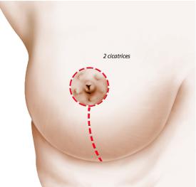 Souvent ces cicatrices ont la forme d'un T inversé avec trois composantes : péri-aréolaire au pourtour de l'aréole entre la peau brune et la peau blanche, verticale, entre le pôle inférieur de l'aréole et le sillon sous-mammaire,horizontale, dissimulée dans le sillon sous-mammaire.