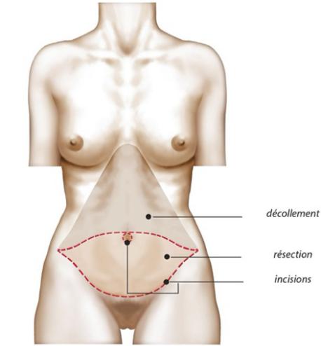 Abdominoplastia es la más comúnmente realizada para la ablación de una gran cantidad de la piel, que corresponde a la totalidad o parte de la zona entre el ombligo y el pubis, en un patrón adaptado a los daños. La piel que recubre sano, situado generalmente por encima del ombligo se recubre hacia abajo, a fin de reconstituir la pared abdominal con una piel de buena calidad.