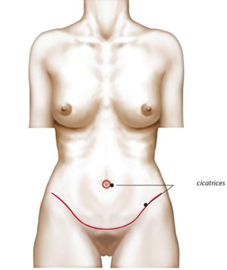 El ombligo se almacena y se coloca en la posición normal a través de una incisión hecha en la piel disminuyó. Tal cirugía siempre deja una cicatriz más o menos largo y más o menos oculta, dependiendo del tamaño y la ubicación de la piel dañada que tenía que realizar la ablación. A menudo, esta cicatriz se encuentra en el borde superior de pelo púbico y va más o menos en los pliegues de la ingle. Su longitud es predecible en gran parte antes de la intervención y el (la) paciente (s) debe ser claramente informado (e) porque "cicatriz" sigue siendo uno de los mayores inconvenientes que tendrán.