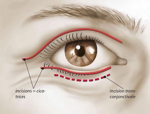 Note: For lower eyelids, where "pockets" alone (without excess skin to be removed), we can perform a blepharoplasty by trans-conjunctival, that is to say using incisions placed inside eyelids and leaving no visible scar on the skin.