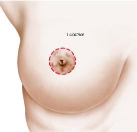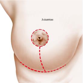 In case of very significant ptosis, the scar has the shape of an inverted T with three components: periareolar around the areola between the brown and white skin, vertical between the lower pole of the areola and the submammary fold, horizontal hidden in the submammary fold. The length of the horizontal scar is proportional to the size of the ptosis.